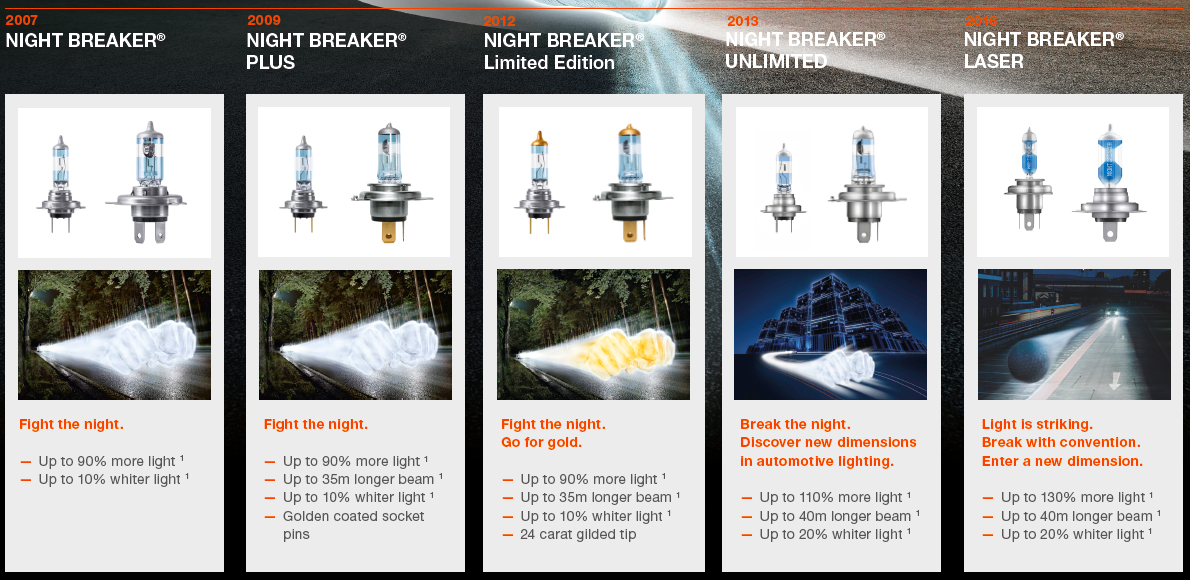 Od uvedenia na trh v septembri 2007 sa rodina výrobkov NIGHT BREAKER neustále rozvíjala a rozširovala. V súčasnosti je portfólio halogénov vybavené vlastnostami NIGHT BREAKER LASER a NIGHT BREAKER UNLIMITED, ktoré ponúkajú o 110% viac svetla v porovnaní so štandardnými halogénovými žiarovkami. Oba rozsahy sú dostupné pre takmer všetky typy žiaroviek ECE.