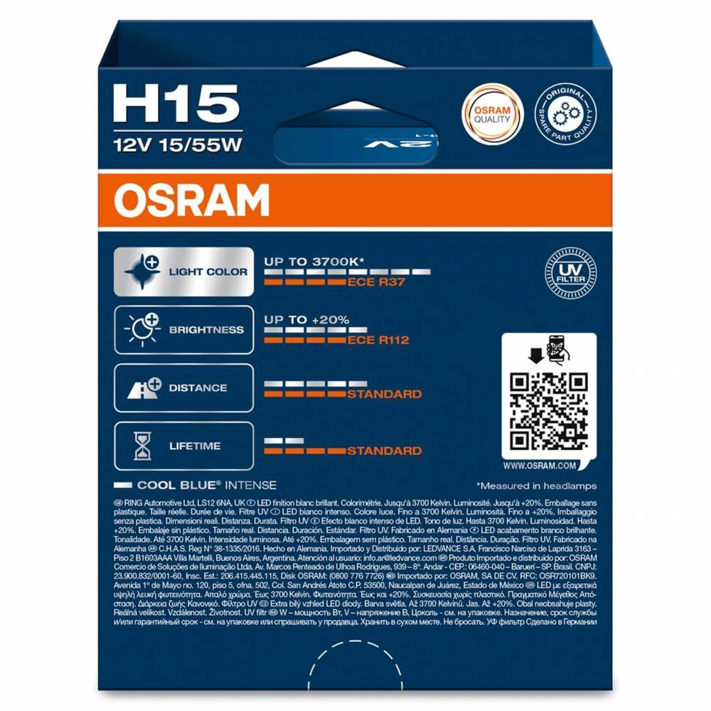 Ich modrasté, jasné, biele svetlo výrazne spríjemňuje každú cestu a dodáva vozidlu vskutku pôsobivý dojem veľmi podobný svetlu LED. Halogénové žiarovky OSRAM COOL BLUE INTENSE NEXTGEN +20%. Vďaka svojmu optimalizovanému dizajnu so strieborným vrchlíkom sú žiarovky H7, H4, H8, H11 a HB3 vhodné aj pre svetlomety s čírym sklom. Pre čo najvyššiu svietivosť dávajte pozor na to aby ste sa pri inštalácií nedotkli prstami sklenenej banky, pretože mastný odtlačok, ktorý by ostal na žiarovke by vám mohol uberať na svietivosti. V prípade, že bude na žiarovke mastný odtlačok, treba ju očistiť vatovým tampónom.