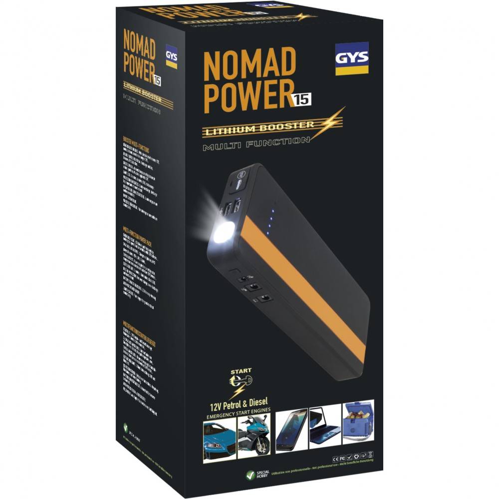 NOMAD 20 funguje ako záložný zdroj energie a pomocné štartovacie zariadenia, takže batéria ako klasická nabíjačka nenabíja, iba batériám pomôže pri vybití, tak aby sa naštartovali a batérie sa potom dobíja jazdou. NOMAD 20 je pomocný štartovací zdroj (booster) 12 V pre osobné automobily s benzínovými aj dieselovými motormi (do objemu 4l), motocykle, štvorkolky, záhradné traktory, kosačky a pod. Lítiová batéria predstavuje výnimočný pomer výkon / veľkosť. Nabíjačka má kompaktné rozmery a integrovanou baterku (2 LED) sa 3 osvetľovacími režimy. Nabíja sieťovou nabíjačkou 230 V alebo pripojením do zásuvky zapaľovača cigariet vozidla cca 6 hodín.