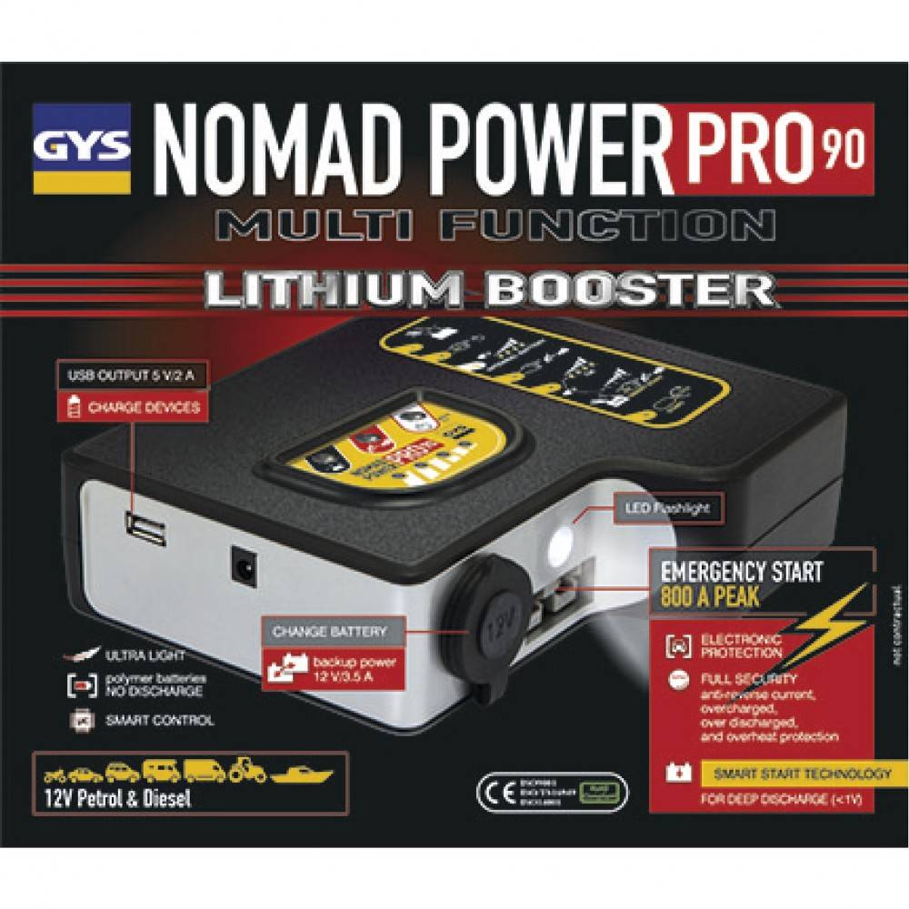 NOMAD 90 funguje ako záložný zdroj energie a pomocné štartovacie zariadenia, takže batéria ako klasická nabíjačka nenabíja, iba batériám pomôže pri vybití, tak aby sa naštartovali a batérie sa potom dobíja jazdou. NOMAD 90 je pomocný štartovací zdroj (booster) 12 V pre osobné automobily s benzínovými aj dieselovými motormi (do objemu 4l), motocykle, štvorkolky, záhradné traktory, kosačky a pod. Lítiová batéria predstavuje výnimočný pomer výkon / veľkosť. Nabíjačka má kompaktné rozmery a integrovanú baterku (1 LED) sa 3 osvetľovacími režimy. Nabíja sieťovou nabíjačkou 230 V alebo pripojením do zásuvky zapaľovača cigariet vozidla cca 9 hodín.