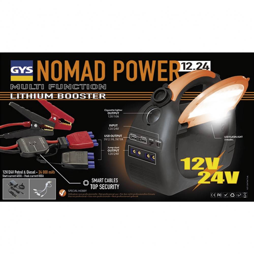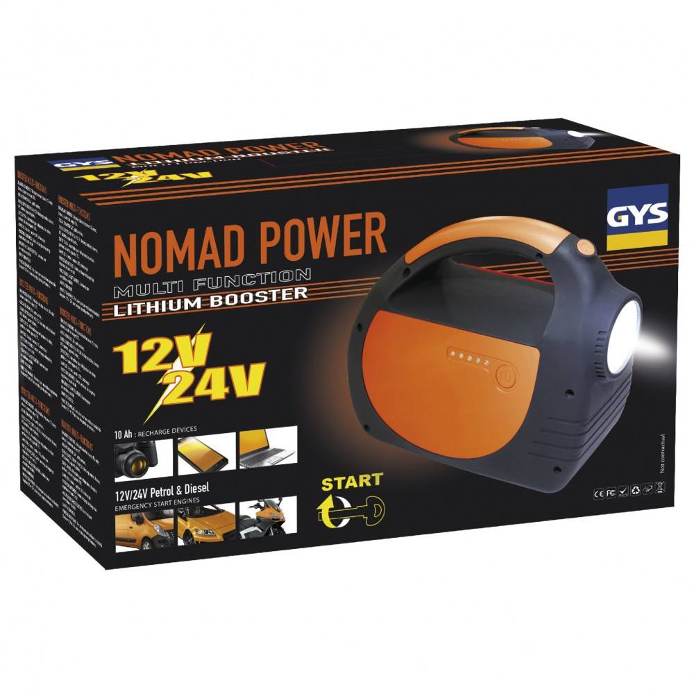 Nabíjací a štartovací zdroj NOMAD POWER 12.24 je externý núdzový akumulátor, ktorý dobíja všetky typy elektronických zariadení, kombinuje 3 funkcie v jednom zariadení. Zdroj je vybavený dvoma 5V USB porty pre nabíjanie smartfónov, tabletov, GPS, atď. A zapaľovačom 12 V pre napájanie elektrických spotrebičov (ventilátor, chladič ...), slúži aj ako núdzové svetlo a booster, čo je núdzový štartovací zdroj pre vozidlá 12V a 24V (motocykle, autá, nákladné automobily).