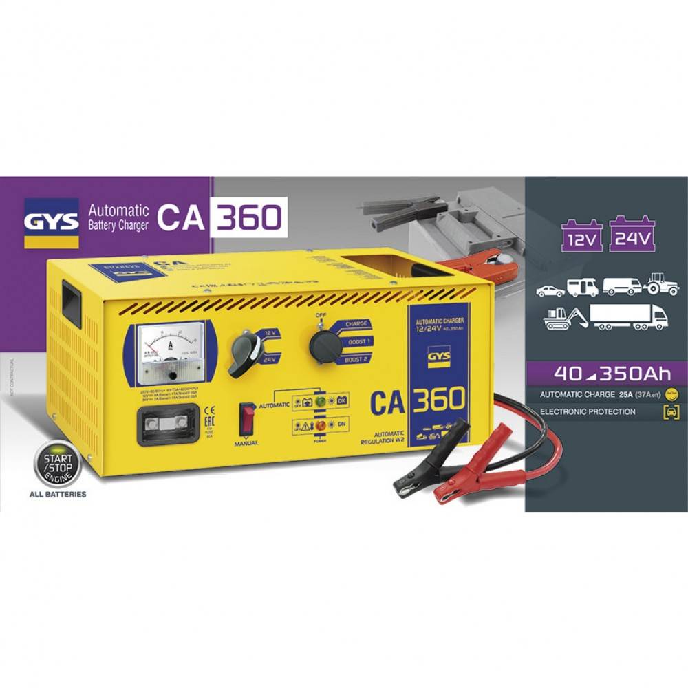 Moderné automatická nabíjačka autobatérií CA 350 Automatic s ampérmetrom. Elektronická regulácia nabíjacieho prúdu (prerušenie nabíjania pri dosiahnutí menovitého napätia článkov a opätovné zapojenie pri pokračovaní nabíjacieho procesu). Kvalitné a šetrné nabíjanie batérií s tekutým alebo pevným / gélovým elektrolytom.
