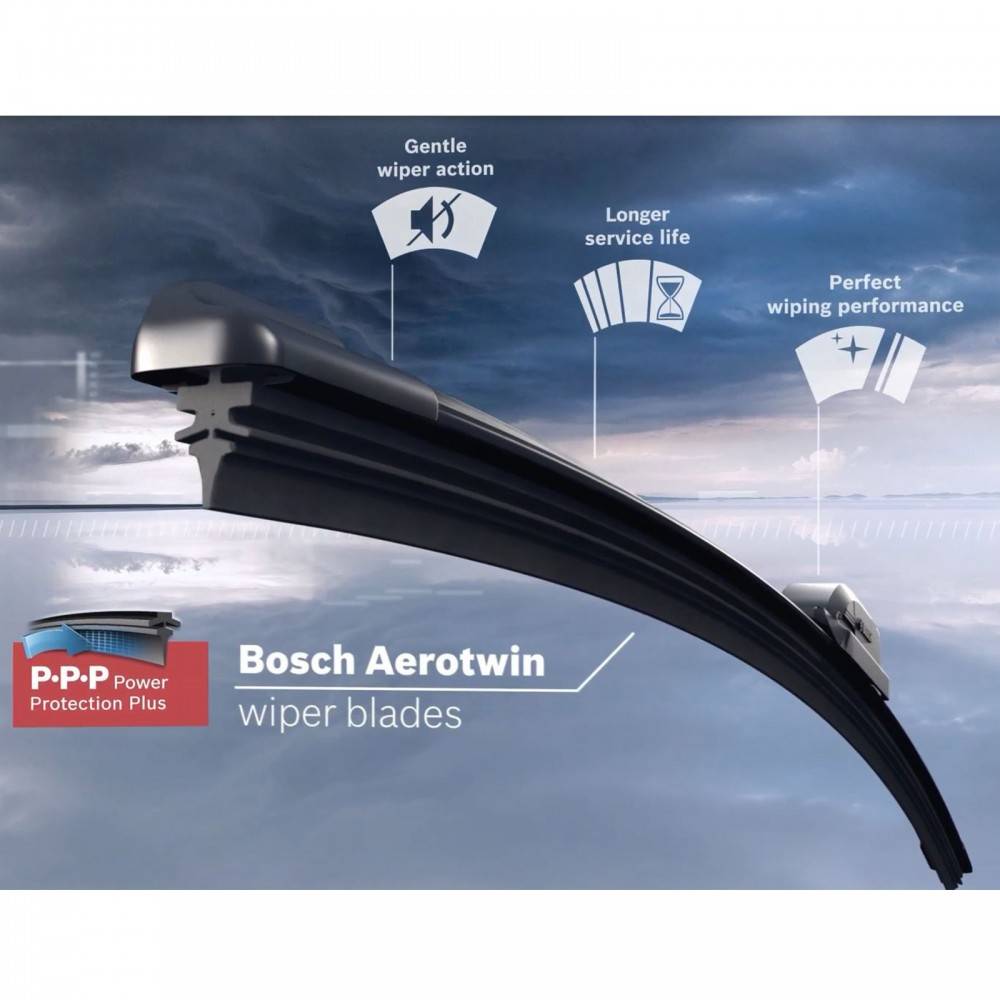 Vďaka 3-komponentnej stieracej gume dosahujú stierače AEROTWIN maximálnu kvalitu stierania, majú dlhšiu účinnosť a sú oveľa menej hlučné ako klasické stierače. Vďaka týmto stieračom jazdíte oveľa bezpečnejšie. Rýchly úspech AEROTWIN stieračov je založený práve na týchto výhodách. Oproti klasickým ramienkovým stieračom sa skladajú z jedného kusu gumového profilu s integrovaným spojlerom. Dve pružinové lišty rovnomerne rozkladajú tlak po celej dĺžke stieracej lišty. Táto vlastnosť zlepšuje výsledky stierania i pri vyšších rýchlostiach. Dokonalé stieranie, vysoká servisná životnosť a jemná stieracia činnosť vďaka technológii Power Protection Plus, čo je inovatívne zloženie gumy s patentovaným poťahom.